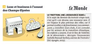 Merci à Emeline Cazi et Juliette Garnier pour cette référence à « Trottoirs ! Une approche économique, historique et flâneuse » dans leur article du Monde sur la manière dont « les acteurs privés ambitionnent de redessiner l’espace public parisien en finançant les aménagements ». A noter : il y a une dizaine d’années, les surfaces situées sur le trottoir ensoleillé (numéros pairs de l’avenue) étaient mieux valorisées en terme locatif que les surfaces à l’ombre (numéros impairs) : « Les prix varient selon la… > Lire la suite