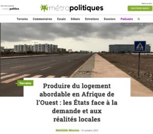 A lire dans Métropolitiques, l’article de Mathilde Mouton sur la production de logement abordable en Afrique de l’Ouest : ici. Extraits : Si des solutions existent pour surmonter ces difficultés – accompagner la création d’aménageurs, instituer des mécanismes de captation de la plus-value foncière et/ou mobiliser la parafiscalité pour financer l’aménagement des sites, favoriser la montée en compétences des promoteurs et développer des filières de production de matériaux locaux pour optimiser les coûts de construction locaux, etc. – leur… > Lire la suite