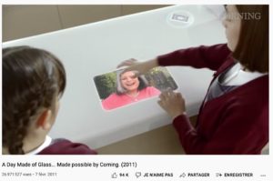Désormais, toute surface horizontale ou verticale devient écran ! « Je téléphone à Mamie et la voici qui apparaît sur la porte du frigidaire ou la table de cuisine » ! Cela marche aussi pour le miroir de la salle-de-bains… … ou la porte du placard ! Les vidéos « A Day Made of Glass » (qui ont été vues par plus de 20 millions de personnes*) ont été réalisées en 2011 et 2012 par Corning pour promouvoir ses vitrages intelligents. La vidéo « best-off »… > Lire la suite