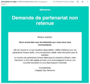 Pour nos fidèles lecteurs qui nous demandent tous les jours où nous en sommes de notre inscription Deliveroo, le verdict vient de tomber ! Nous ré-essaierons une prochaine fois ! En attendant, on pourra écouter notre podcast-interview de Pedro, livreur Deliveroo et Uber Eats : ici.