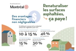 « Renaturaliser les surfaces asphaltées, ça paye ! », indique le Centre d’écologie urbaine du Québec, qui liste « des avantages financiers non négligeables », avec notamment le fait qu’un bâtiment commercial ou industriel entouré de végétation peut voir : sa valeur marchande augmenter de 10 à 15%, ses espaces vacants se louer 46% plus rapidement ; ses coûts de chauffage diminuer jusqu’à 15% en hiver ; ses frais de climatisation diminuer jusqu’à 30% en été ». Si vous avez des chiffres de même… > Lire la suite