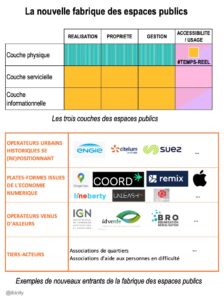 Le Réseau National des Aménageurs vient de mettre en ligne notre note sur « la nouvelle fabrique des espaces publics ». Celle-ci est téléchargeable ici ou sur le site du RNA. Cette note propose une grille d’analyse des changements à l’oeuvre dans la fabrique des espaces publics. Elle montre notamment comment deux nouvelles « couches » viennent s’ajouter à la « couche physique » traditionnelle. D’une part, la « couche servicielle » se développe avec des installations sur l’espace public qui « rendent des services », notamment aux… > Lire la suite