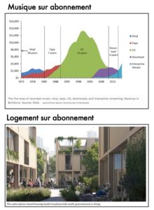 La vi(ll)e devient de plus en plus sur abonnement. Pour la musique bien-sûr : « Présenté comme révolutionnaire il y a dix ans, l’achat de musique par téléchargement ne cesse de perdre du terrain face à l’écoute en streaming. Au point que le pionnier Apple envisagerait de fermer son iTunes Store. » « Dans l’empire de la musique enregistrée dominée par Universal, Sony et Warner , l’ère du téléchargement payant paraît très brève si on la compare aux 21 années de pouvoir incontesté… > Lire la suite
