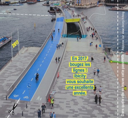 Après le « grand huit pédestre » de 2016, c’est cette fois-ci avec une piste cyclable qu’ibicity vous souhaite une très bonne année 2017 !! Plus précisément, il s’agit de la passerelle Inderhavnsbroen, qui relie les quartiers de Nyhavn et de Christianhavn, en plein centre de la ville de Copenhague. Elle a été ouverte en juillet 2016. Mesurant 180 mètres de long, c’est une passerelle à la fois pour piétons et cyclistes, qui fait partie du « Harbour ring », route de 13 kilomètres de long… > Lire la suite