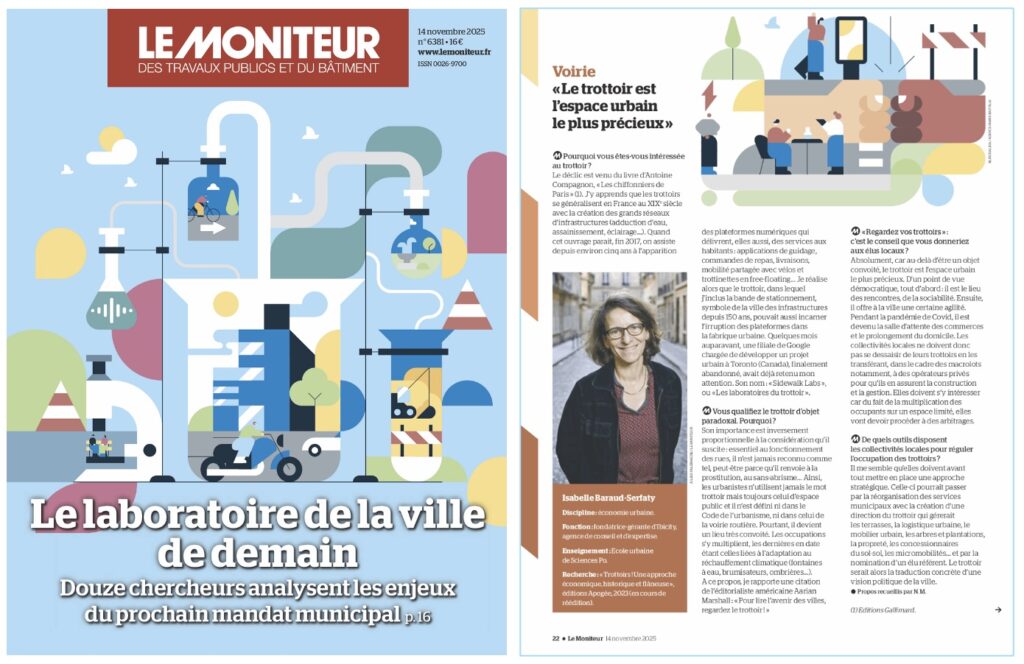 Merci à la revue Le Moniteur et à la journaliste Nathalie Moutarde pour avoir retenu le trottoir parmi les enjeux du prochain mandat municipal. Pour lire ou feuilleter Trottoirs ! Une approche économique, historique et flâneuse (Editions Apogée), c’est : ici. Pour le commander directement : là. Pour en savoir plus sur les missions de conseil d’ibicity (ibicity autofinance largement sa recherche), lire le Carnet d’économie urbaine ibicity 2025. Le Moniteur explore en effet « le laboratoire de la ville… > Lire la suite
