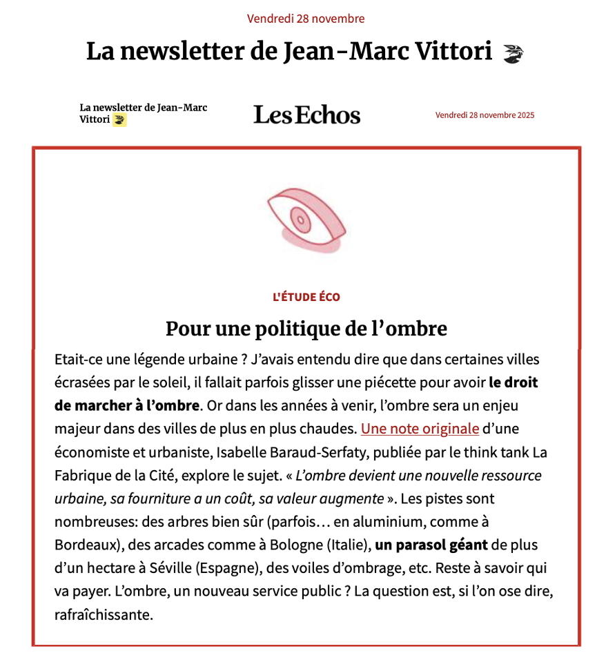 A lire dans la newsletter de Jean-Marc Vittori, éditorialiste aux Echos, un écho de notre note pour la Fabrique de la cité : La note « quel partage de l’ombre dans les villes de demain ? » est en ligne : ici.
