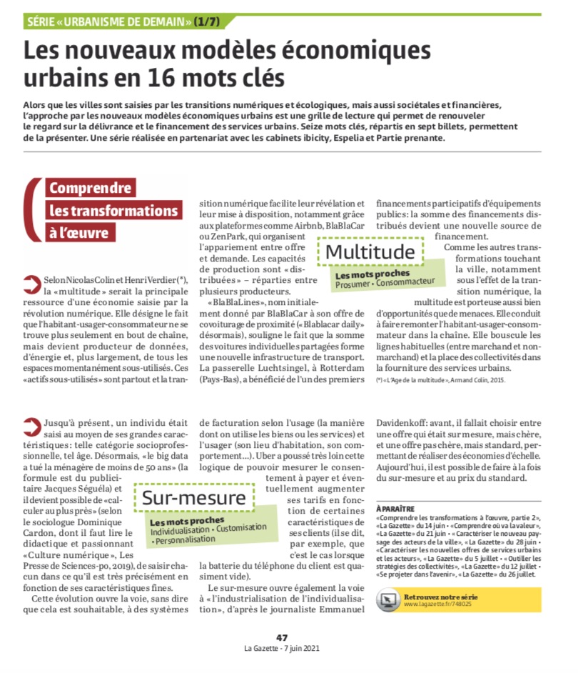 Nous avions déjà annoncé le webinaire « tout comprendre sur les nouveaux modèles économiques urbains », qui se tiendra mardi 9 juin à 14H30 : ici. En parallèle, La Gazette des Communes produit dans son édition papier une série de 7 fiches, qui présentent les 16 mots clefs des nouveaux modèles économiques urbains. La première fiche est parue dans le numéro de cette semaine. Le feuilleton s’achèvera le 26 juillet. L’ensemble des travaux qui sont ainsi résumés (co-réalisés avec Espelia et Partie… > Lire la suite