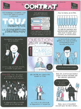 Une fois n’est pas coutume ! C’est en bande-dessinée qu’un montage en partenariat public-privé (PPP) est évoqué. L' »article » figure dans le dernier numéro de La Revue Dessinée (printemps 2016, #11), et nous nous sommes précipités pour le lire – merci à Vivien Ch. de nous l’avoir signalé. Sur le fond : nous ne connaissons pas le projet de Cité sanitaire de Saint-Nazaire, mais de manière générale, on regrettera une approche classiquement très manichéenne. Mais si la critique des BTPistes est très convenue… > Lire la suite