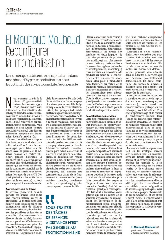En lien avec l’outil chaîne de valeur que nous utilisons pour comprendre le nouveau paysage des acteurs de la fabrique urbaine, il faut lire la tribune que publie dans le Monde El Mouhoub Mouhoud, professeur d’économie à l’Université Paris-Dauphine : « Reconfigurer la mondialisation » (Le Monde – 11 octobre 2020). Extraits (c’est nous qui soulignons) : Le numérique a fait entrer le capitalisme dans une phase d’hyper-mondialisation pour les activités de services. (…) La seconde phase [de la mondialisation] voit, dans… > Lire la suite