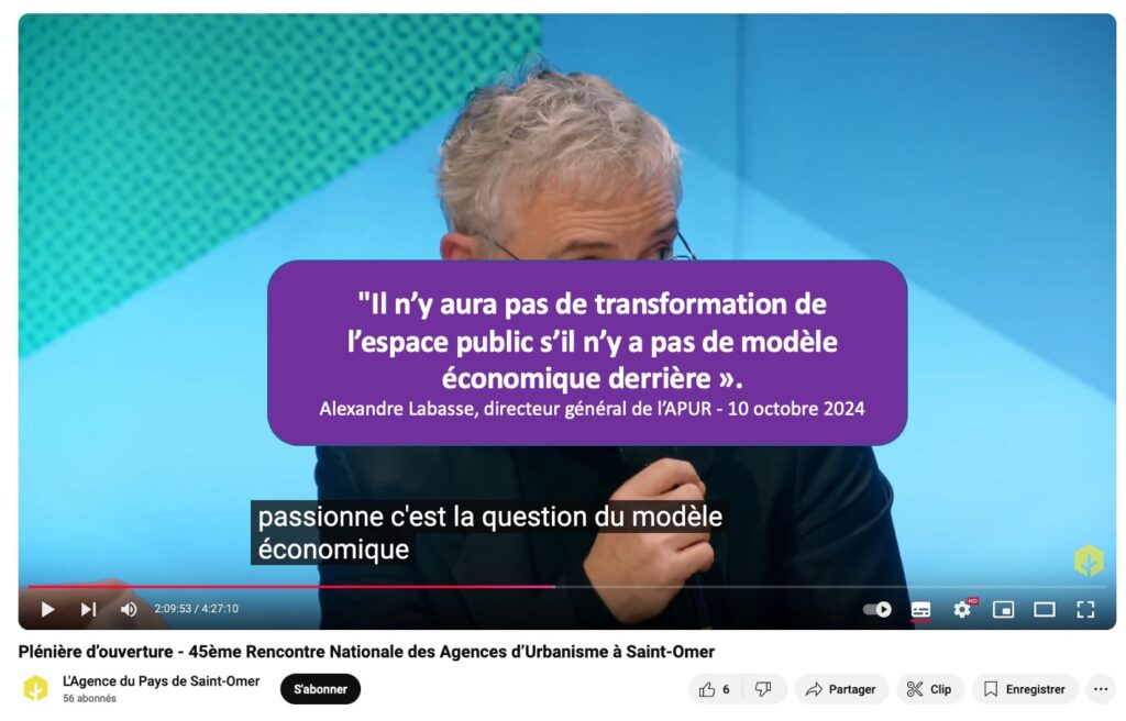 Merci à la FNAU (Fédération Nationale des Agendes d’Urbanisme) pour avoir mis en ligne le replay de la « Plénière d’ouverture des 45ème Rencontre Nationale des Agences d’Urbanisme à Saint-Omer ». C’est en effet avec beaucoup d’intérêt que nous avons écouté l’intervention d’Alexandre Labasse, directeur général de l’APUR (c’est nous qui soulignons) : Et puis il y a un élément qu’on commence à étudier, qui nous passionne, c’est la question du modèle économique de l’espace public, parce que toutes les évolutions des… > Lire la suite