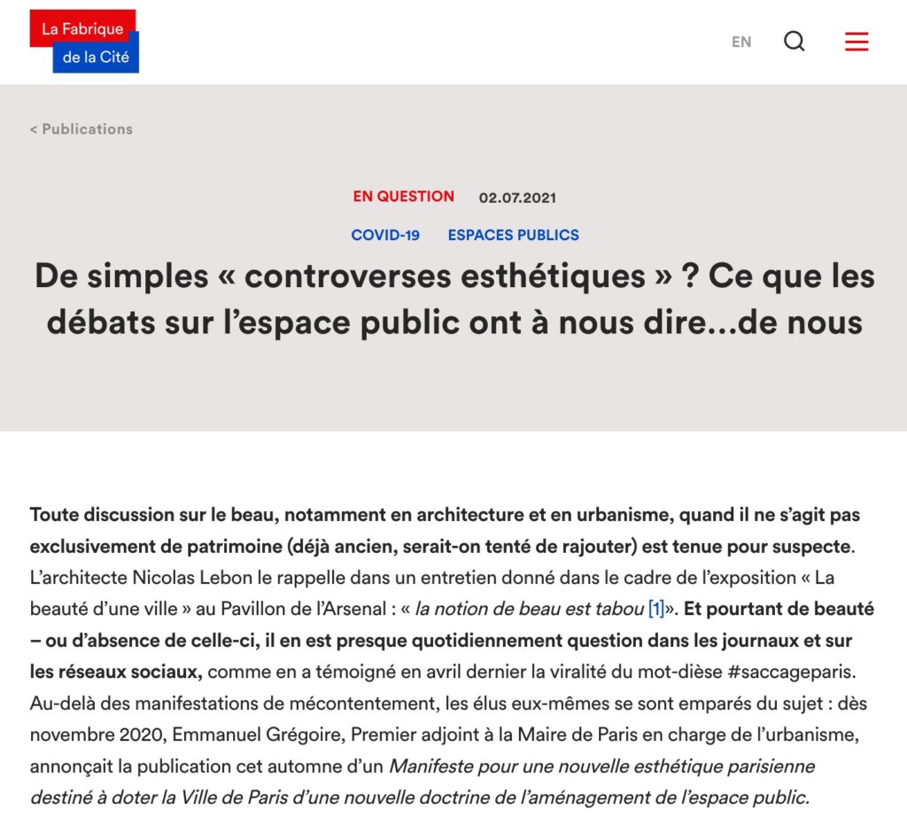 Sous la plume de Chloé Voisin-Bormuth, sa directrice des études et de la recherche, la Fabrique de la Cité publie une note approfondie qui vient contribuer de manière incisive au débat sur la nouvelle esthétique de la capitale. Extrait : Toute discussion sur le beau, notamment en architecture et en urbanisme, quand il ne s’agit pas exclusivement de patrimoine (déjà ancien, serait-on tenté de rajouter) est tenue pour suspecte. L’architecte Nicolas Lebon le rappelle dans un entretien donné dans le… > Lire la suite