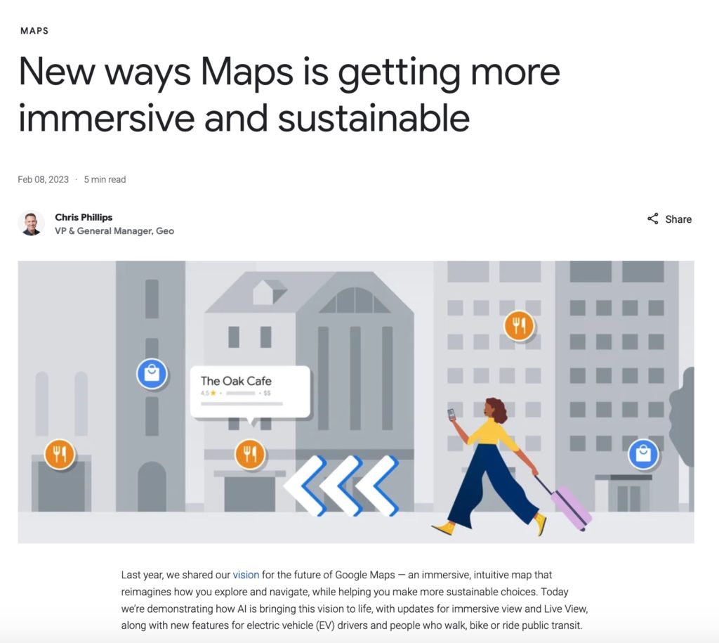 A lire, dans le prolongement de notre article sur « The new value of curbs », les nouvelles fonctionnalités proposées par Google Maps : « New ways Maps is getting more immersive and sustainable », qui vient d’être publié sur le blog de Google. Extraits : Last year, we shared our vision for the future of Google Maps — an immersive, intuitive map that reimagines how you explore and navigate, while helping you make more sustainable choices. Today we’re demonstrating how AI is bringing… > Lire la suite