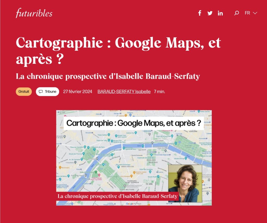 L’Association de prospective Futuribles propose depuis quelques mois à certains de ses conseillers scientifiques de rédiger une chronique prospective régulière. Voici donc notre première chronique prospective : « Google Maps, et après ? ». Extrait : « Vingt ans après sa création, l’omniprésence de Google Maps comme outil cartographique pour permettre aux citadins de se repérer dans les villes est aujourd’hui incontestable. Par exemple, avant de se rendre dans un magasin physique, près de 9 Français sur 10 recherchent son emplacement sur Google… > Lire la suite