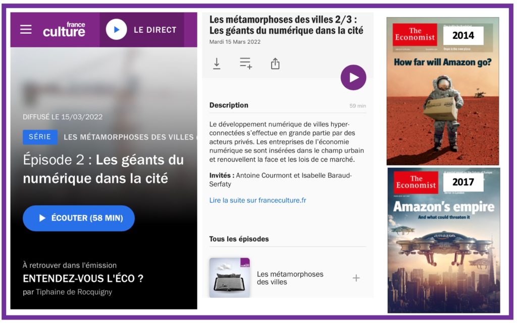 « Entendez-vous l’éco ? », l’émission de Tiphaine de Rocquigny qui croise économie et sciences sociales (sur France Culture, du lundi au vendredi de 14h à 15h, et en podcast), consacrait ses trois dernières émissions aux « métamorphoses des villes ». Nous avons eu le plaisir d’intervenir dans l’épisode 2, « Les géants du numérique dans la cité », aux côtés d’Antoine Courmont, directeur de la Chaire Villes et numérique de Sciences Po (que nous retrouverons dans le prochain séminaire « Futurs de villes » de Futuribles )…. > Lire la suite