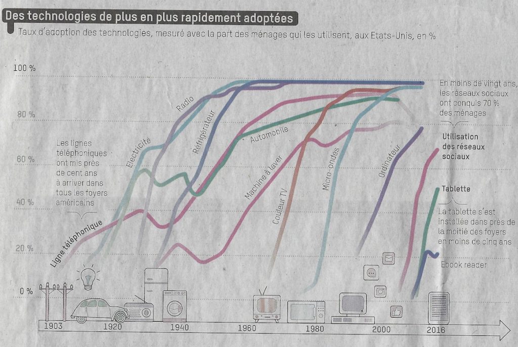 Taux d’adoption des technologies, mesuré avec la part des ménages qui les utilisent, aux Etats-Unis, en % : Source : « Comment le numérique accélère nos vies » – Le Monde – 26 juin 2020