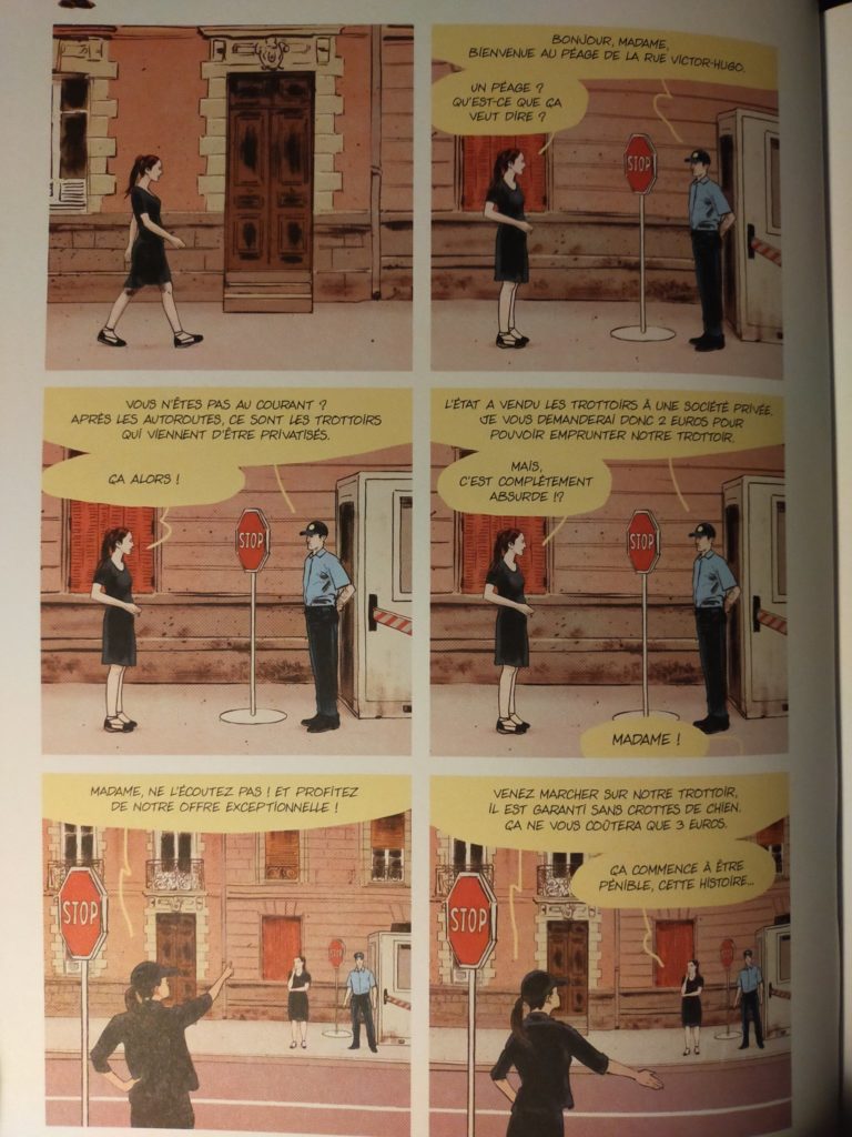 Merci à Benjamin Pradel de nous avoir signalé cette planche de BD sur la « privatisation des trottoirs » (« Il faut pas prendre les gens pour des cons » de Reuzé et Roubaud). L’occasion de relire cet extrait du roman de Titiou Lecoq où il était déjà question de la « compétitivité » entre les trottoirs pairs et les trottoirs impairs !