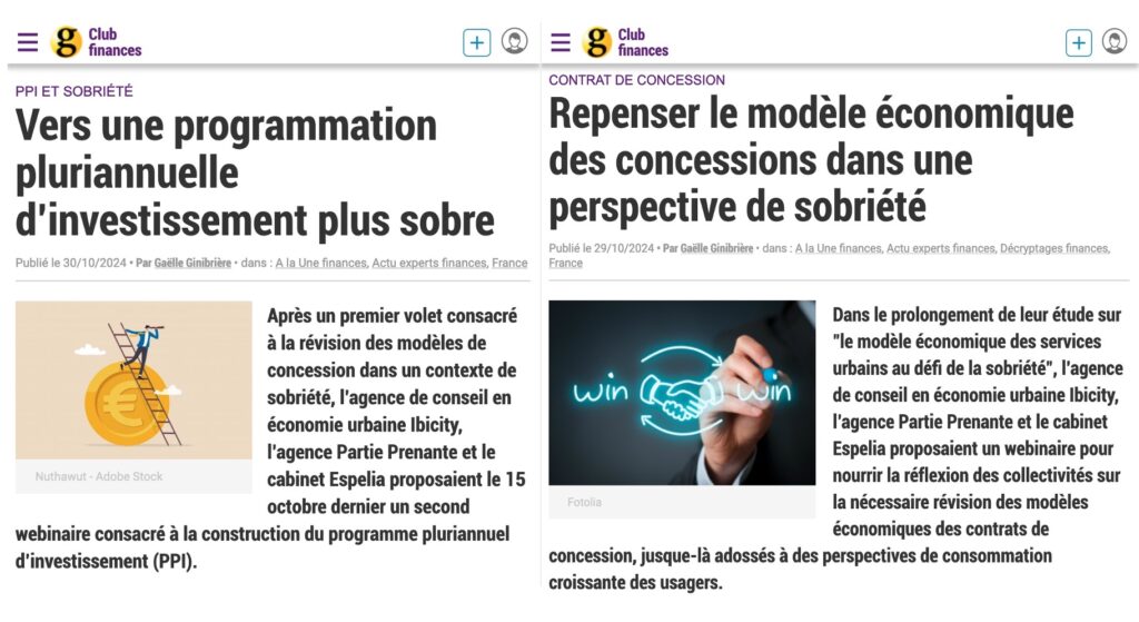 A lire dans La Gazette des communes : Vers une programmation pluriannuelle d’investissements plus sobre, de Gaëlle Ginibrière, publié le 30/10/2024 Après un premier volet consacré à la révision des modèles de concession dans un contexte de sobriété, l’agence de conseil en économie urbaine Ibicity, l’agence Partie Prenante et le cabinet Espelia proposaient le 15 octobre dernier un second webinaire consacré à la construction du programme pluriannuel d’investissement (PPI). Repenser le modèle économique des concessions dans une perspective de… > Lire la suite
